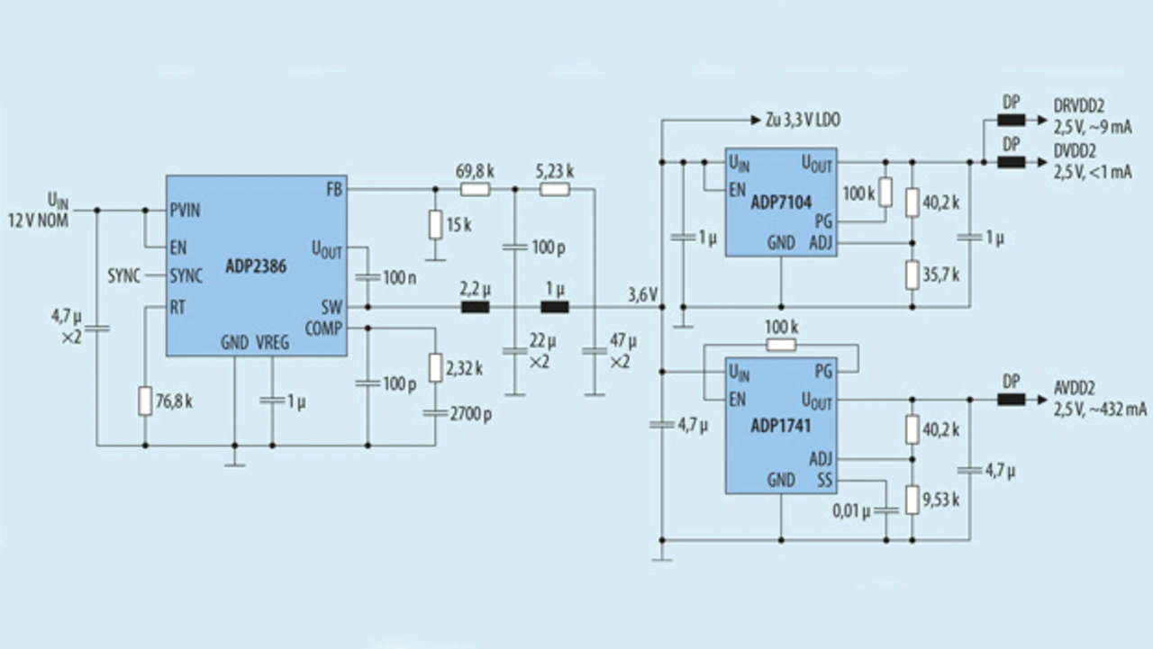 Stromanforderungen für jeden weiteren Spannungspegel enthalten. In einer vollständigen Stromversorgung werden sieben unterschiedliche Versorgungspegel in die drei Spannungspegel 1,3 V, 2,5 V und 3,3 V überführt. Die Blockschaltung von Bild 1 stellt die komplette Stromversorgung dar. In diesem System agieren die Schaltregler – zwei abwärts wandelnde 20-V-/6-A-Wandler mit LC-Filtern ADP2386 – als Vorregler auf die Zwischenbusspannungen von 3,6 V und 2,1 V. Der 3,6-V-Ausgangsregler ist in Bild 3 dargestellt. Die Zwischenspannungen werden mit LDO-Reglern weiter auf jeden geregelten Eingangsspannungspegel des A/D-Wandlers heruntergewandelt. Die LDO-Regler liefern die geregelten Spannungen für den A/D-Wandler und dämpfen das Ausgangsrauschen des Schaltreglers effektiv.