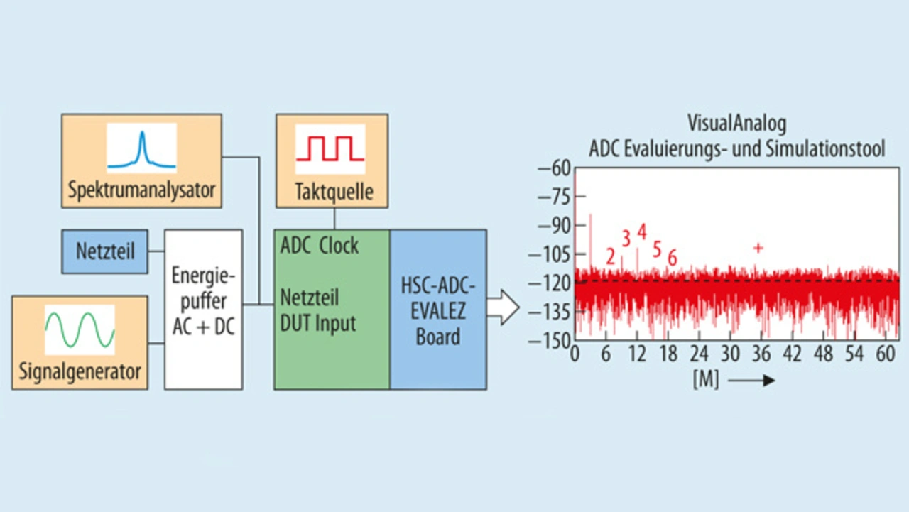 Das AC-PSRR des A/D-Wandlers wird erfasst, indem ein Sinuswellensignal an den Stromversorgungs-Pin anlegt und die Amplitude des angelegten Signals direkt am Stromversorgungs-Pin des Prüflings gemessen wird – abgenommen am Schirmentkoppelungskondensator nahe am Stromversorgungs-Pin. Eine digitalisierte Messkurve (spur) erscheint bei der korrespondierenden Frequenz im Rauschteppich der Fast-Fourier-Transformation (FFT) des A/D-Wandlers. Das Verhältnis der gemessenen Amplitude des angelegten Signals und der korrespondierenden Amplitude der digitalisierten Messkurve im FFT-Spektrum des A/D-Wandlers ist der Versorgungsspannungsdurchgriff (PSRR). Bild 5 zeigt die Blockschaltung eines typischen Aufbaus zur AC-PSRR-Messung.
