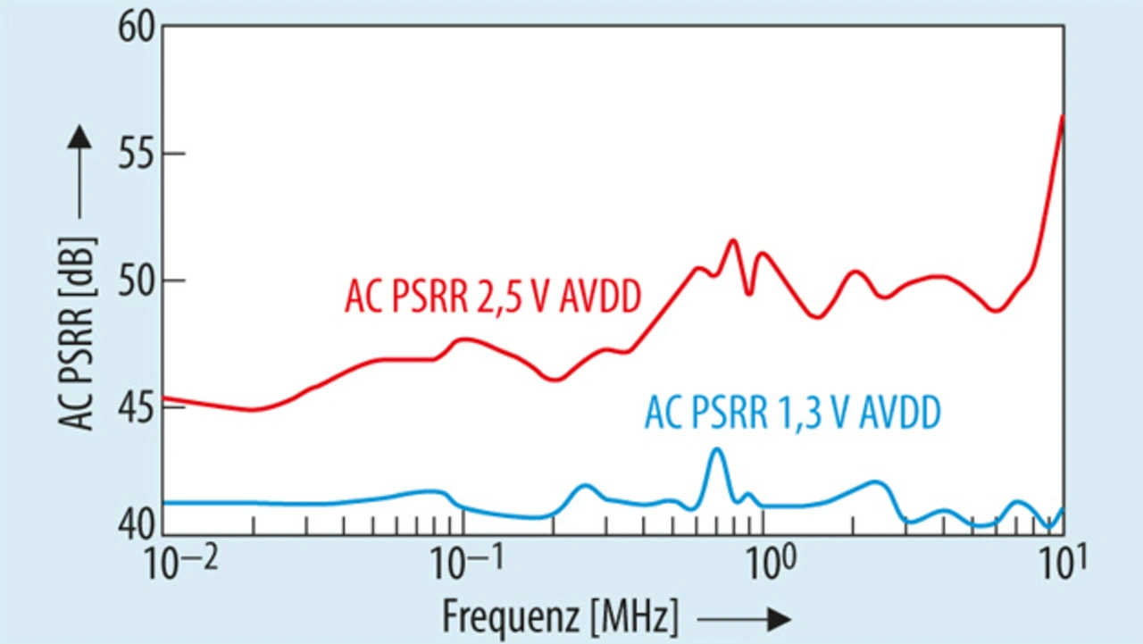 Bei Einsatz eines 2,6-GS/s-A/D-Wandlers AD9625 wird eine 1-MHz-Sinuswelle mit 100 mV Amplitude von Spitze zu Spitze aktiv in den analogen 1,3-V-Stromver-sorgungspegel eingekoppelt. In diesem Fall erscheint in der FFT eine digitalisierte 1-MHz-Kurve über dem Rauschteppich des Wandlers bei -61,8 dBFS, was einer Spitze-zu-Spitze-Spannung von 892 µVp-p in Referenz zum Vollskalenbereich von 1,1 V des analogen Eingangs entspricht. Das Berechnen der AC-PSRR bei 1 MHz unter Einsatz der Gleichung ergibt einen AC-PSRR von 41 dB.