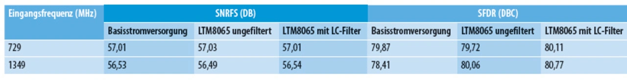 Tabelle 1 zeigt das dynamische Verhalten des AD9625 bei Versorgung durch jede dieser drei Konfigurationen. Es wurden zwei unterschiedliche Eingangsträgerfrequenzen verwendet – 729 MHz und 1349 MHz. Wenn der A/D-Wandler mit den beiden LTM8025-basierenden Stromversorgungen gespeist wird, sind die Ergebnisse von SNR und SFDR vergleichbar mit denen der Basisstromversorgung. Die Daten zeigen, dass der LTM8065 den AD9625 direkt ohne den Einsatz zusätzlicher LDO-Regler versorgen kann, was die Gesamtlösung wesentlich vereinfacht.