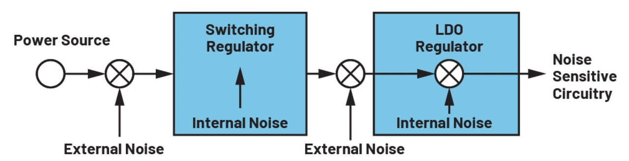 LDO-Regler werden nur selten direkt zwischen der Energiequelle und den zu versorgenden Schaltkreisen verwendet - der Leistungsverlust wäre in den meisten Fällen zu hoch. Stattdessen verwenden Entwickler typischerweise entweder einen AC/DC- oder einen DC/DC-Schaltregler. Da die Energiequelle den Schaltregler speist, kann dieser zusätzlich zu seinem Eigenrauschen externes Rauschen aufnehmen, welches durch Störstrahlung und andere Effekte in den Leitungen oder auf den Leiterplatten entsteht. Erschwerend kommt hinzu, dass es in einem solchen Schaltregler nie den »idealen« Schalter gibt, und alle Schaltvorgänge Effekte wie Spannungsspitzen und Überschwingen (Ringing) erzeugen, die schließlich zu internem Rauschen werden. Schaltregler können von der Last entfernt platziert werden und die Spannung kann auf ihrem Weg zu ihr zusätzlich externes Rauschen aufnehmen.