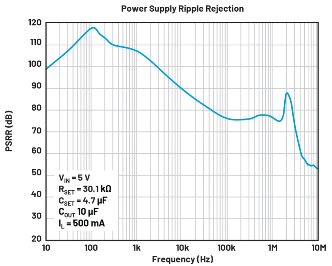Der PSRR-Wert (Netzspannungsdurchgriff oder Störspannungsunterdrückungsverhältnis) kennzeichnet die durch die Eingangsspannung verursachten Schwankungen der Ausgangsspannung (Bild 3). Der PSRR-Wert wird in logarithmischer Form bei einer bestimmten Frequenz ausgedrückt und variiert mit der Last und der Eingangs-/Ausgangsspannung. Da das Eingangsrauschen nicht am Ausgang reflektiert werden soll, ist es von entscheidender Bedeutung LDO-Regler mit hohem PSRR-Wert zu verwenden. Da sich der Hochfrequenz-PSRR-Wert durch eine Erweiterung der Schaltung um kleine Tiefpassfilter vor und nach dem LDO-Regler verbessern lässt, ist der PSSR-Wert bei einer niedrigeren Frequenz für die IC-Auswahl wichtiger. Bei der Auswahl der Bauteile ist zu beachten, dass jeder Unterschied von 20 dB eine 100-fache Verbesserung oder Verschlechterung bei der Unterdrückung der Welligkeit (Ripple) bedeutet.
