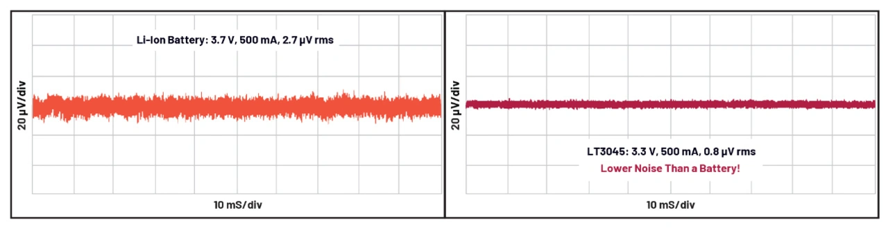 Der letzte wichtige Aspekt ist das gesamte (integrierte) Ausgangsrauschen, d. h. der Effektivwert der über einen endlichen Frequenzbereich integrierten spektralen Rauschdichte. Bei Analog/Digital- oder Digital/Analog-Wandlern wird das Gesamtrauschen des LDO-Reglers von DC bis zur Bandbreite des Systems integriert, was wiederum die Systemgenauigkeit beeinträchtigt. Für solche Anwendungen ist daher das Gesamtrauschen am Ausgang wichtig. Bild 5 zeigt das integrierte Rauschen des LT3045, das geringer ist als das einer Li-Ionen-Batterie.