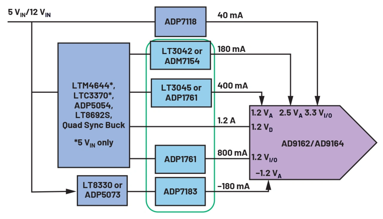 Allerdings sind die Systembaugröße sowie die Kosten etwas höher, wenn alle Versorgungsspannungen von Silent-Switcher-Reglern geliefert werden. Ein alternativer Ansatz, der alle Vorteile wie hohe Effizienz, geringe Kosten, kleine Abmessungen und niedriges Rauschen vereint, ist der Einsatz eines PMICs und eines invertierenden Reglers als erste Stufe. Ein Beispiel ist ein PMIC mit vier Ausgängen wie beispielsweise die Bauteile LTM4644, LTC3370, ADP5054 (für einen 12-V-Bus) und LT8330/ADP5073 für den invertierenden Regler. Dann folgen auf jede Ausgangsspannung rauscharme LDO-Regler für alle empfindlichen Spannungen mit Ausnahme der 1,2V VD (Bild 6).