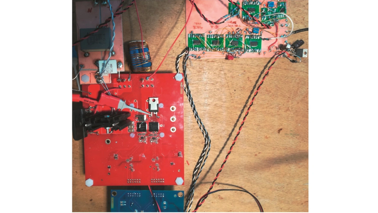 Weil die Schaltzeiten der GaN-Transistoren nur einige Nanosekunden betragen, werden parasitäre Induktivitäten und Kapazitäten zu sehr hochfrequenten Schwingungen angeregt. Dies führt zu erheblichen Störungen am Eingang und am Ausgang, was auch die Messungen stark beeinträchtigt. Deshalb kommen die in Bild 3 dargestellten Filter zum Einsatz. Die gemessenen Schaltsignale, jeweils gemessen zwischen Drain- und Source-Anschluss der GaN-Transistoren zeigt Bild 4, den zugehörige Messaufbau Bild 5. Bei dem verwendeten GaN-Transistor wurde festgestellt, dass zwischen Drain und Source am Schalter SiC-Dioden in Sperrrichtung (D3 und D4) notwendig sind, damit während der Totzeit (GaN ist rückwärts leitend, Gate off) keine Oszillationen auftreten. Bild 4 zeigt die Messung des Ausschaltverhaltens der Drain-Source-Spannung am GaN-Transistor einmal ohne (links) und einmal mit externen Dioden (rechts). Der Schaltvorgang dauert weniger als 7 ns, ist also etwa zehnmal kürzer als bei Superjunction-MOSFETs. Damit reduzieren sich auch die Ein- und Ausschaltverluste um diesen Faktor.