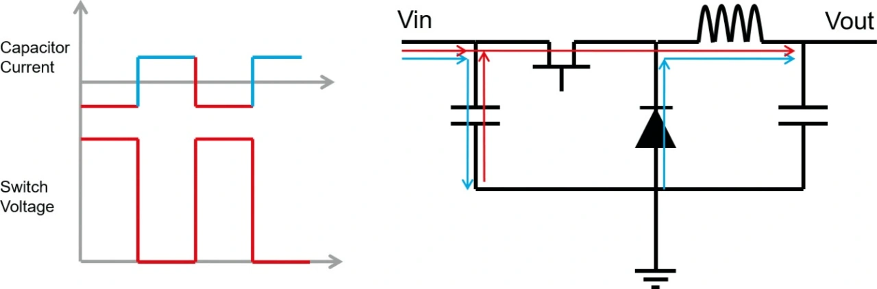 Alle Abwärtswandler brauchen Eingangskondensatoren. Sie speichern die Ladung, die den Strompuls liefern, wenn der High-Side-Schalter eingeschaltet wird. Sobald der High-Side-Schalter wieder ausgeschaltet wird, werden die Kondensatoren wieder aufgeladen (Bild 1).
