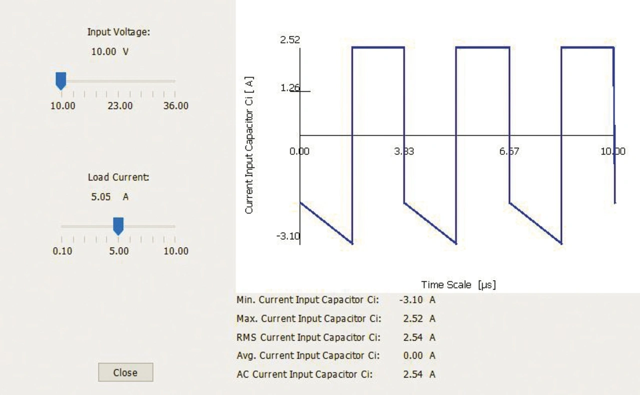 Um die Eingangskondensatoren für DC/DC-Abwärtswandler korrekt spezifizieren zu können, muss der Entwickler die RMS-Ströme in diesen Kondensatoren kennen. Er kann die Ströme entweder mithilfe von Gleichungen oder mithilfe von Softwaretools wie dem Power Stage Designer von TI abschätzen. Mit diesem Tool lassen sich die Ströme in bis zu drei parallelen Kondensatorzweigen abschätzen.