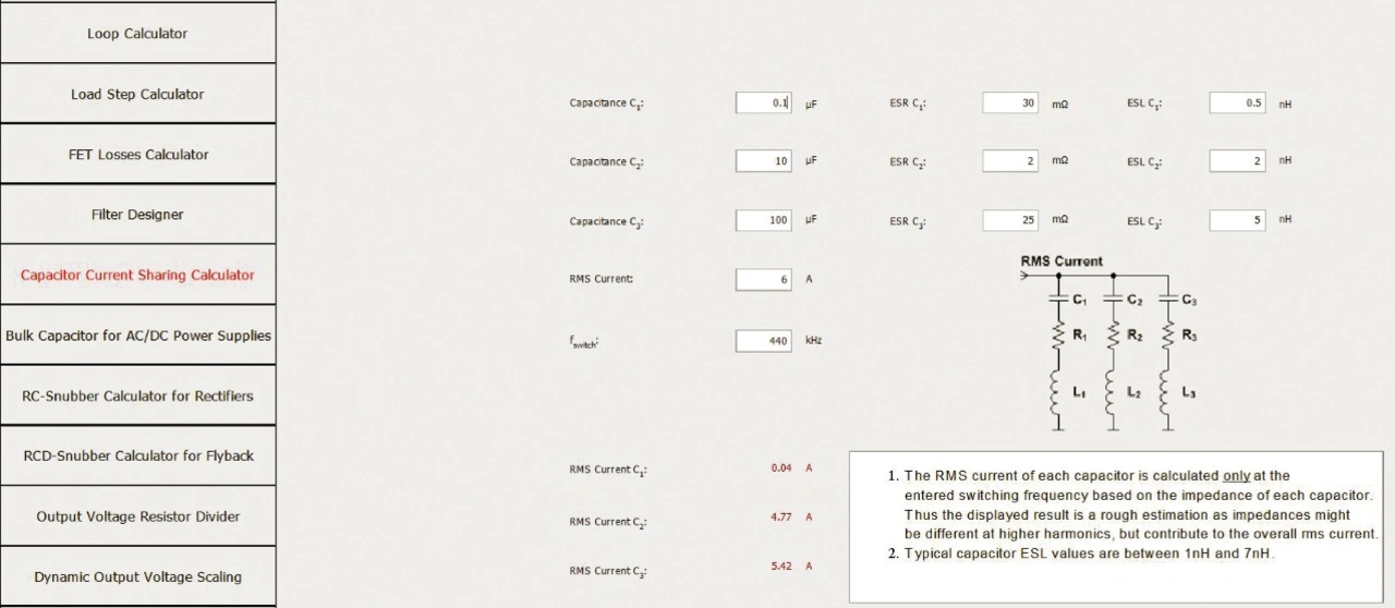 Kommen mehrere größere MLCCs zum Einsatz, können diese zusammengefasst werden, und es reicht, ihre Ersatzkapazität in den »Current-Sharing«-Rechner einzugeben, um die RMS-Ströme in parallelen Eingangskondensatoren zu berechnen. Obwohl bei der Berechnung des RMS-Stroms nur die Grundschwingung zugrunde gelegt wird, stellt das Tool eine sinnvolle Verfeinerung der Berechnung des RMS-Stroms für einen einzigen Eingangskondensator dar.