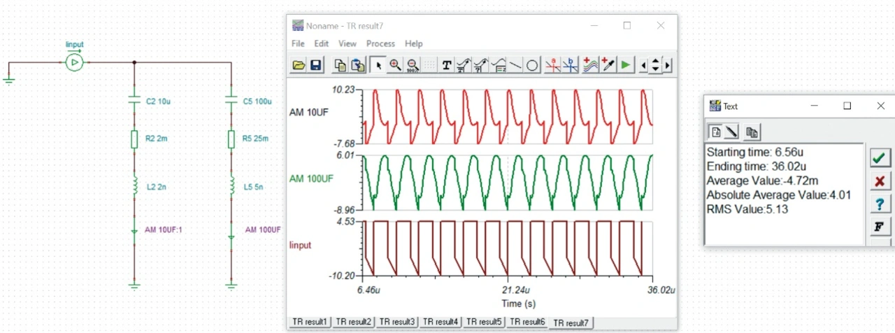 Mit TINA-TI kann der RMS-Strom in den einzelnen Zweigen wie folgt ermittelt werden: Führen Sie die Simulation aus, klicken Sie auf den gewünschten Stromverlauf und wählen Sie unter dem Menüpunkt »Process« im Waveform-Fenster die Funktion »Averages« aus. TINA-TI verwendet eine numerische Integration über das Intervall zwischen Start- und Endzeit der dargestellten Simulation, um den Effektivstrom zu berechnen.