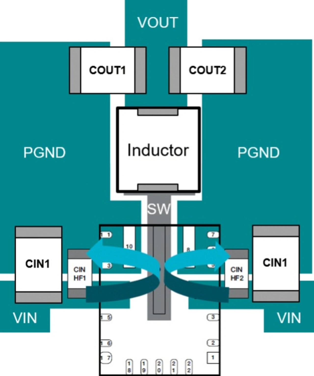 Die spiegelbildliche Pin-Konfiguration ermöglicht den Anschluss zweier identischer, paralleler Eingangsschleifen. Folglich lässt sich die doppelte Eingangskapazität (Hochfrequenz und Bulk) parallel in der Nähe der beiden Paare mit Power-Input- und Power-Ground-Pins (PVIN und PGND) platzieren. Diese Aufteilung auf zwei parallele Stromschleifen hat außerdem zur Folge, dass sich die effektive parasitäre Eingangsinduktivität halbiert.