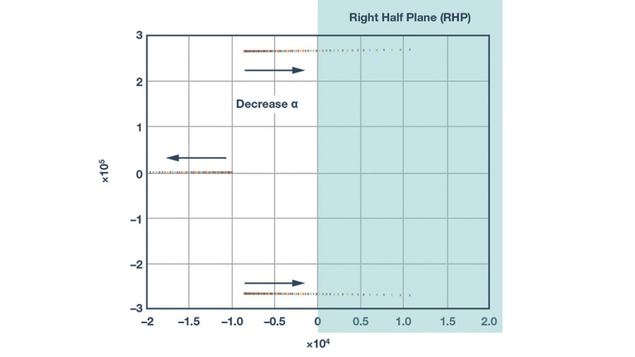 Abgesehen von den Parametern in der Leistungsstufe gibt es zwei weitere Parameter in der Übertragungsfunktion der Rückkopplung. Parameter β (= 1+ RA/RB) ist das Vergrößerungsverhältnis der Ausgangsspannung, das bereits gut bekannt ist. Der Parameter α (= RA·CF) ist in diesem Konzept jedoch völlig neu. Dieser Rückkoppelparameter lässt sich einstellen, um das Verhalten der Übertragungsfunktion der Rückkoppelung zu verstehen; die genaue Herleitung findet sich in [7]. Bild 7 zeigt die Änderung der Nullstellen in der Rückkoppelübertragung, wenn der Wert von α steigt. Es zeigt sich deutlich, dass bei erhöhtem α ein Paar von konjugierten Nullstellen von der linken in die rechte Halb-Ebene (RHP) wandert.