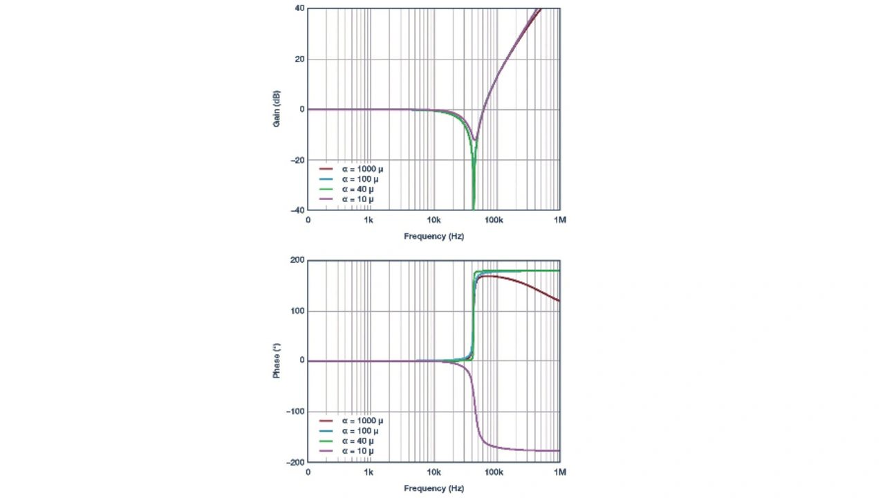 Bild 8 zeigt den Frequenzgang der Rückkoppel-Übertragungsfunktion bei unterschiedlichen Werten von α. Sinkt α auf den Wert 10–6 (z. B. wenn RA = 10 kΩ und CF = 1 nF), weist die Übertragungsfunktion des Rückkoppelnetzwerks eine Phasenverzögerung von 180° auf. Dies bedeutet, dass die komplexen Nullstellen auf rechte Halb-Ebene gerutscht sind. Die Rückkoppel-Übertragungsfunktion lässt sich in einer neuen Form vereinfachen: