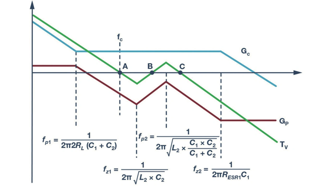 Diese Übertragungsfunktion besitzt mehr Nullstellen als Polstellen, und die zusätzlichen Nullstellen führen bei der Resonanzfrequenz, die von L2 und C2 bestimmt wird, zu einem vorlaufenden Phasenversatz von 180°. Deshalb kompensieren die zusätzlichen Nullstellen in der Übertragungsfunktion der Rückkopplung die zusätzliche Phasenverzögerung in der Übertragungsfunktion der Regelung der Ausgangsspannung. Dies vereinfacht das Design der Kompensation basierend auf der vollständigen Übertragungsfunktion von der Regelung bis zur Rückkopplung.