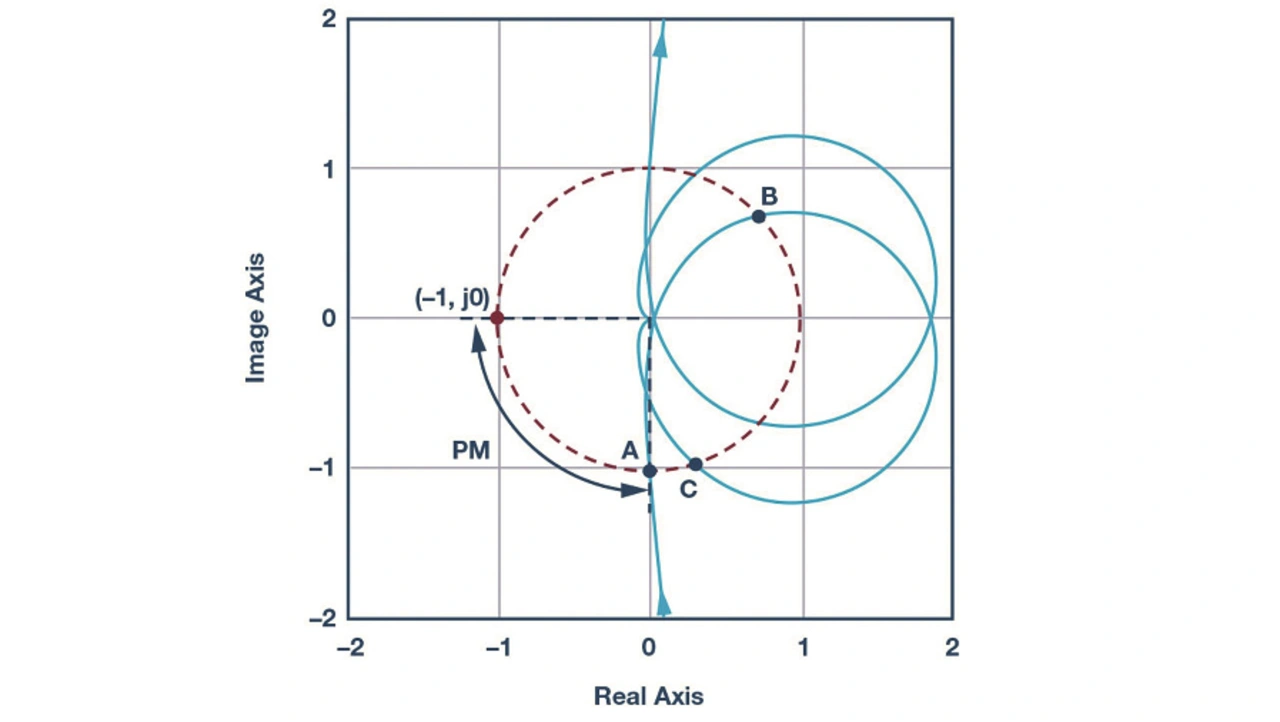 Nach Bild 8 kreuzt die Übertragungsfunktion des geschlossenen Regelkreises Tv(s) die Nulllinie dreimal. Mithilfe eines Nyquist-Diagramms lässt sich die Stabilität dieser Übertragungsfunktion analysieren (Bild 10). Da diese Kurve weit von (–1, j0) entfernt ist, ist der geschlossene Regelkreis stabil und die Phasenreserve groß genug. Man beachte, dass die Punkte A, B und C im Nyquist-Diagramm mit den Punkten A, B und C im Bode-Diagramm korrespondieren.