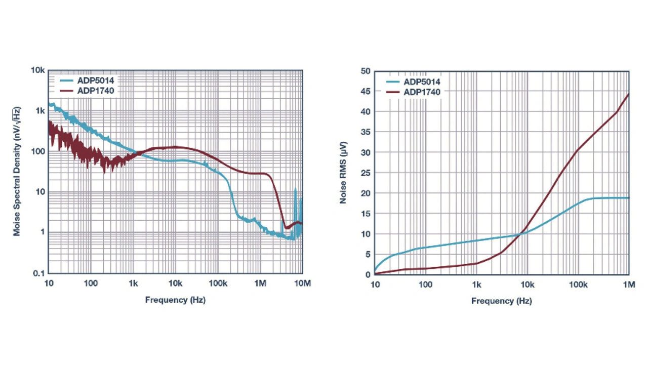 Bild 12 zeigt die gemessene spektrale Rauschdichteverteilung des ADP5014 im Frequenzbereich von 10 Hz bis 10 MHz und die integrierte RMS-Rauschdichteverteilung im Bereich zwischen 10 Hz und 1 MHz im Vergleich zum ADP1740, einem rauscharmen 2-A-Linearregler. Das Ausgangsrauschen des Schaltreglers ADP5014 ist im HF-Bereich deutlich besser als das des linearen ADP1740.