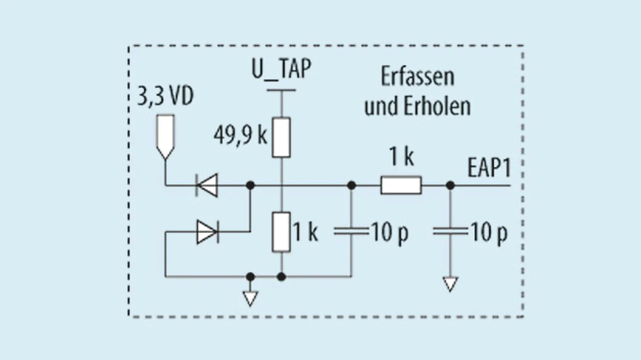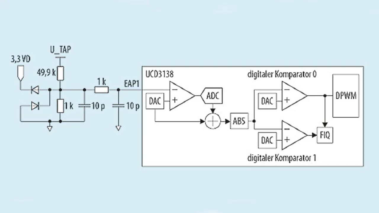 Eine Lösung für dieses Problem ist eine Spannungsmessschaltung, die den SR umgehend abschaltet. Die Abschaltung erfolgt, bevor der Rückstrom entsteht, nämlich sobald die Eingangsspannung unter den zur Aufrechterhaltung der Ausgangsspannung erforderlichen Grenzwert fällt. Die in Bild 5 gezeigte Schaltung erfasst die Eingangsspannung am Mittenabgriff des Übertragers (U_TAP). Der zum Front-End-Teil des UCD3138 gehörende Pin EAP1 lässt sich so konfigurieren, dass er die Spannung nur während der Einschaltzeit des primärseitigen Schalters abtastet, wenn die an U_TAP liegende Spannung eine Eingangsspannung widerspiegelt.