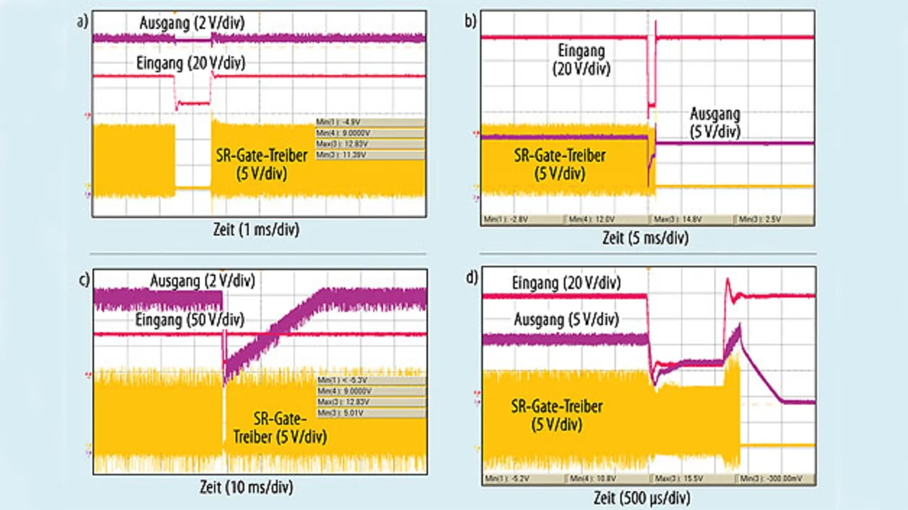 Die ursprüngliche EVM-Lösung verfügt über keine Pre-Bias-Startup-Funktion, wenn die Eingangsspannung zu ihrem normalen Wert zurückkehrt. Dies hat ein Überschwingen der Ausgangsspannung zur Folge und lässt den Überspannungsschutz ansprechen, nachdem die Eingangsspannung wiederhergestellt ist (Bild 7d). Für einen Volllast-Test wird die Ausgangsspannung in der vorgeschlagenen Lösung vom Verbraucher abgebaut (Bild 7c). Sobald sich die Eingangsspannung erholt, kann der Ausgangs umgehend und monoton wieder zu seiner geregelten Spannung zurückkehren – kontrolliert von der Pre-Bias-Startup-Routine. Die vorgeschlagene Lösung lässt die Ausgangsspannung nahezu unverändert, solange die Eingangsspannung über dem erforderlichen Mindestwert zur Aufrechterhaltung der Ausgangsspannung liegt. Die Lösung vermeidet außerdem das Entstehen von Rückströmen, wenn die Eingangsspannung kleiner als dieser Grenzwert ist. Schließlich wird ein stringenter, monotoner Spannungsverlauf erzielt, wenn die Eingangsspannung zu ihrem Normalwert zurückkehrt.