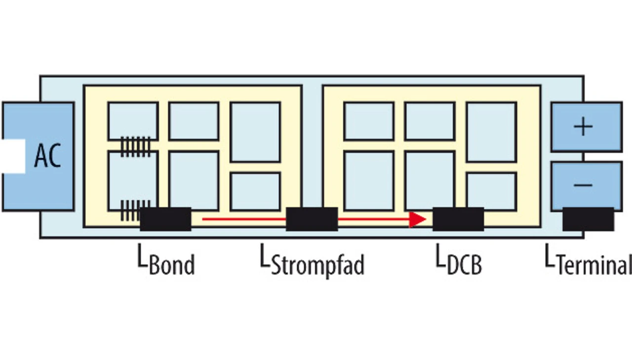 17-mm-Module haben in der Regel eine Halbbrückenbestückung mit Lastanschlüssen auf gegenüberliegenden Seiten. Die IGBTs und Dioden sind bei den meisten Modulen jeweils antiparallel angeordnet. Einflussfaktoren für die Modulinduktivität sind das Design der DC-Anschlüsse, die Chip-Anordnung mit entsprechendem Bond-Design, die Ausführung der Strompfade und die Zwischenkreisanbindung (Bild 1). Diese Induktivität führt zu Überspannungen während des Ausschaltens des IGBTs. Diese Überspannung reduziert die Marge für den sicheren Betrieb (safe operating area) und erfordert im schlechtesten Fall Module mit höheren Spannungsklassen, als eigentlich für die Leistungsklasse notwendig wären.
