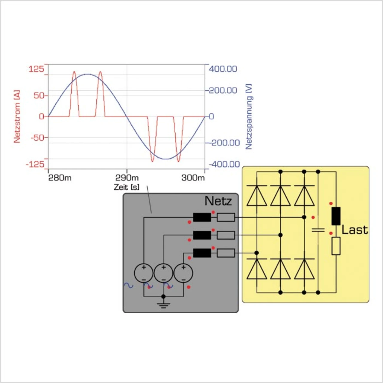 Geräte mit gesteuertem oder ungesteuertem Gleichrichter und Zwischenkreiskondensator, wie sie in jedem Schaltnetzteil oder Frequenzumrichter vorkommen, nehmen eine nach Bild 1 von der Sinusform abweichende, stark verzerrte Stromkurve auf.