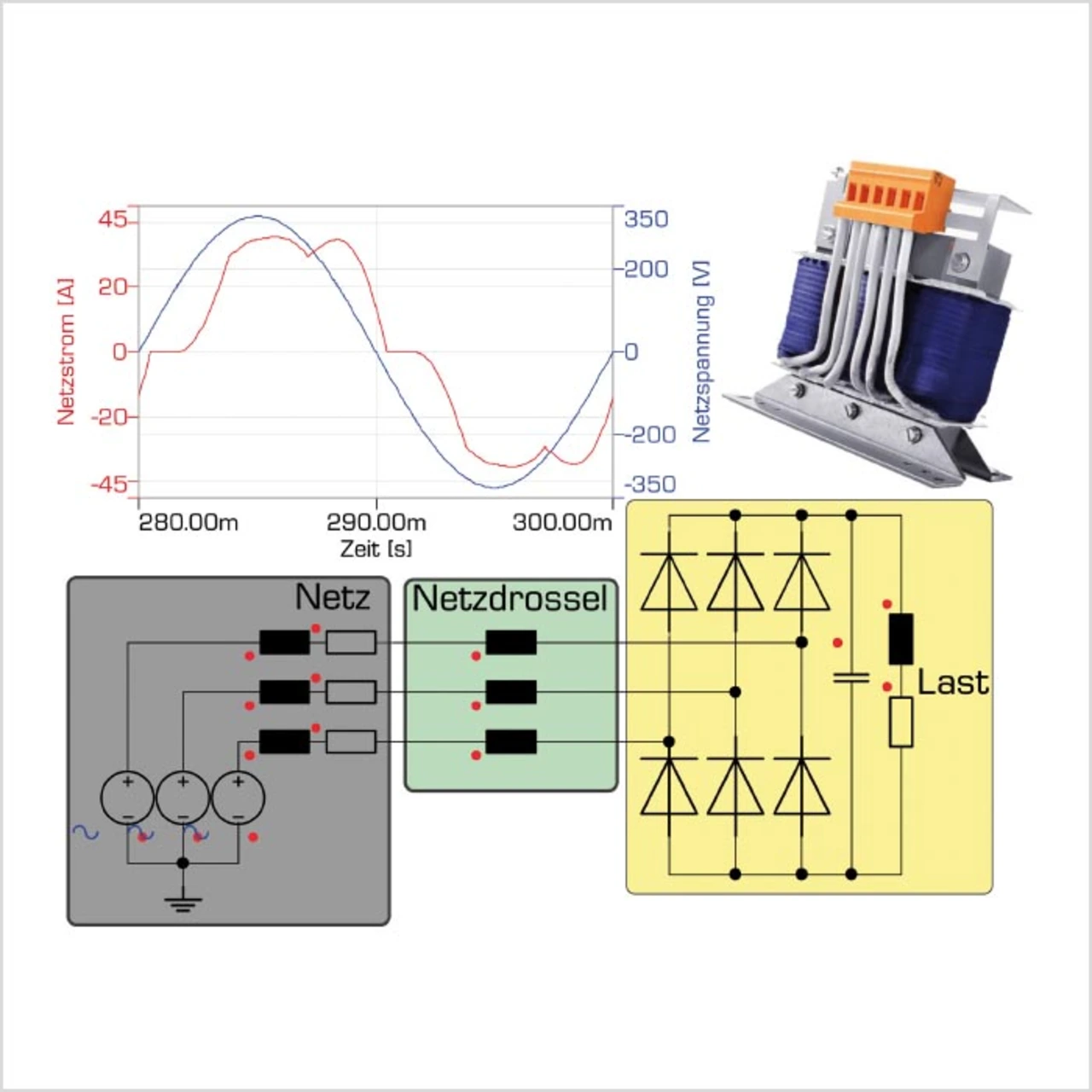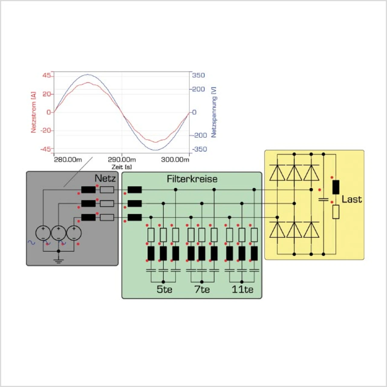 Im einfachsten Fall wird eine Netzdrossel nach Bild 5 benutzt. Sie stellt die günstigste Lösung von allen Filtermöglichkeiten dar, indem sie durch Verlängerung der Stromflussdauer die Stromoberschwingungen reduziert. Wenn die einfache Drossel nicht mehr ausreicht, um Grenzwerte einzuhalten, ist es notwendig, Oberschwingungen durch Filterkreise herauszufiltern. Eine Netzdrossel ist in jedem Fall zusätzlich nötig, um für die Oberschwingungen eine höhere Impedanz ins Netz zu gewährleisten. Bei hoher Oberschwingungsbelastung über ein breites Spektrum sind viele Filterkreise für jede relevante Frequenz erforderlich (Bild 6).