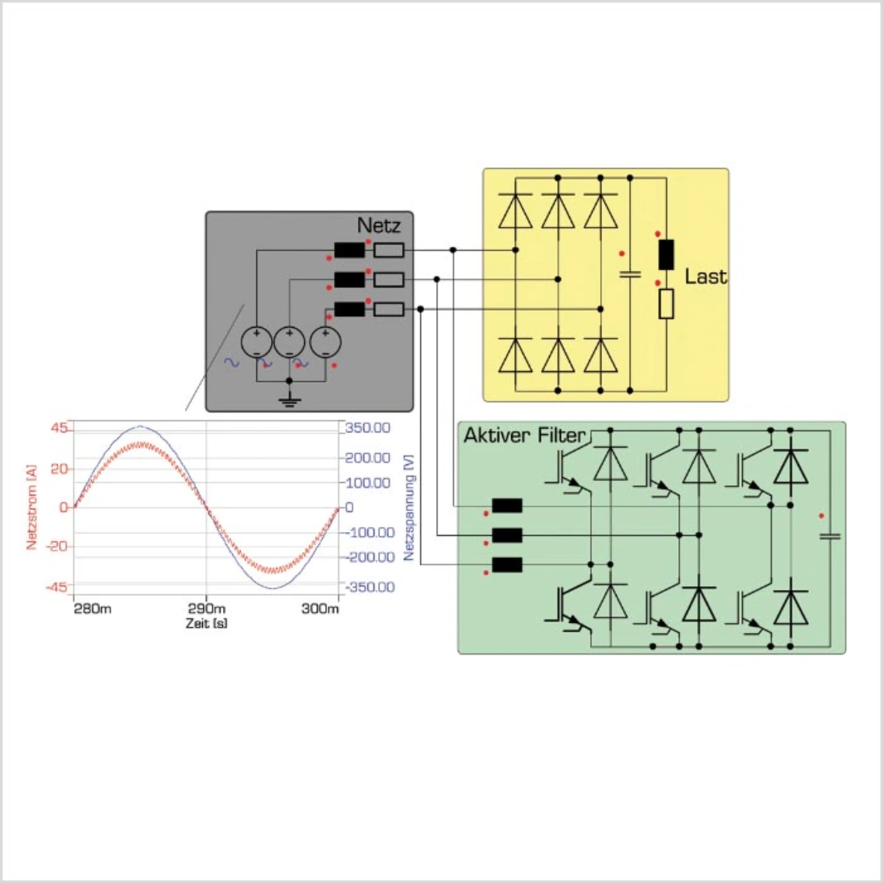 Aktive Filter sind nach Bild 4 im Grunde modifizierte, rückspeisefähige Frequenzumrichter, die parallel zum Netz eingesetzt werden. Sie erfassen im Netz vorhandene Oberschwingungen und speisen sie um 180° phasenverschoben wieder ins Netz zurück. So lässt sich laut Theorie der beste Leistungsfaktor erreichen. Die Vorteile der aktiven Filter sind: