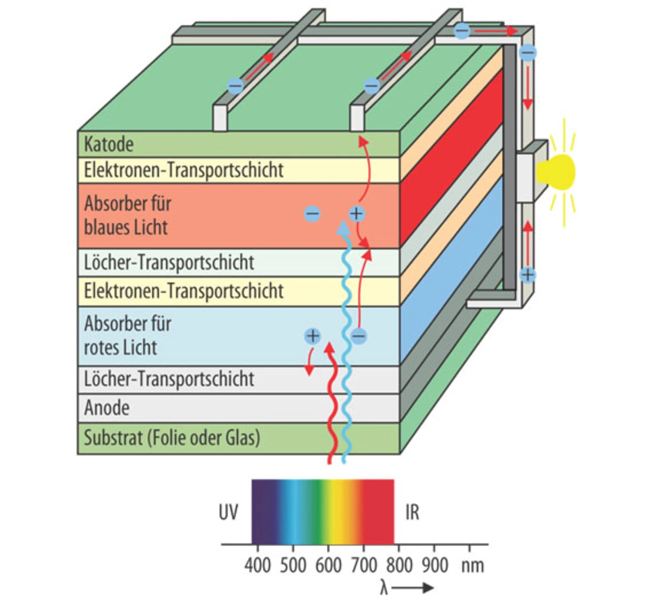 Der derzeit meistversprechende Ansatz zur Steigerung des Wirkungsgrades organischer Solarzellen ist die Tandem-solarzelle [3]. Entsprechend Bild 3 werden in einer Tandemsolarzelle zwei Solarzellen mit unterschiedlicher spektraler Absorption integriert – eine Solarzelle mit einer größeren Bandlücke zur Absorption von blauem und grünem und eine Solarzelle mit einer kleineren Bandlücke zur Absorption von rotem und infrarotem Licht. Die Solarzellen werden bereits während der Herstellung elektrisch miteinander verbunden.