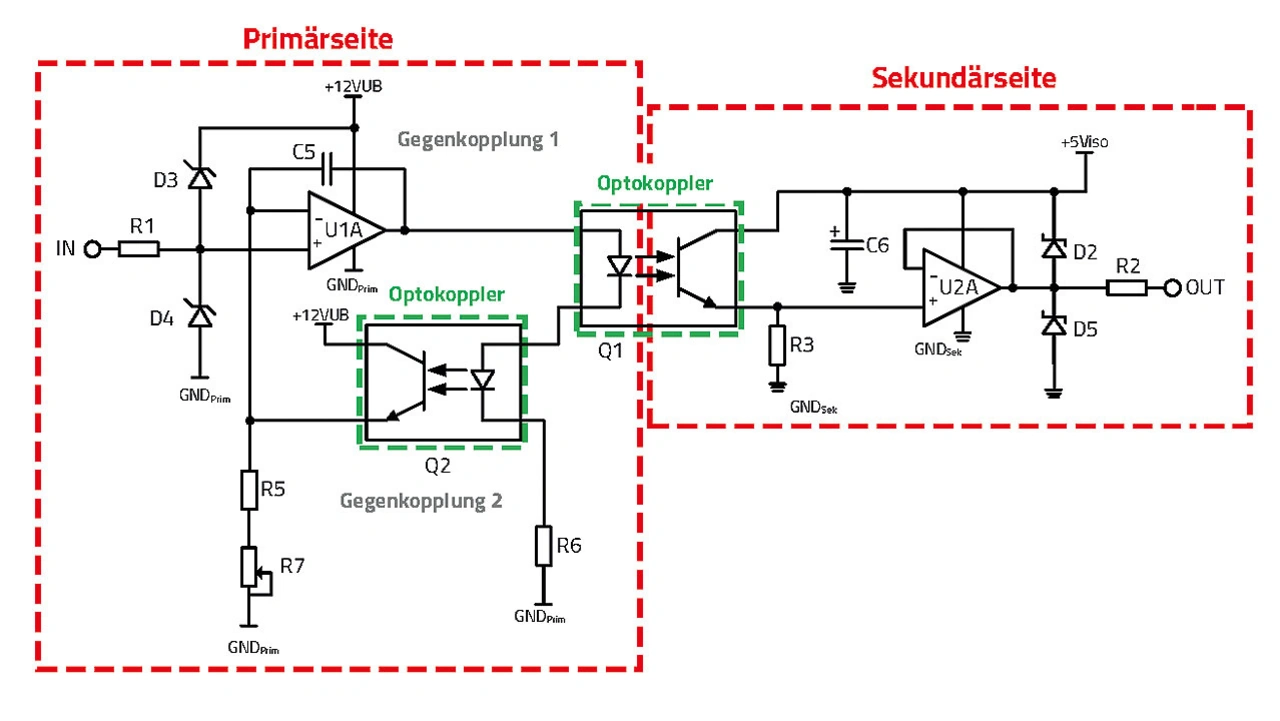 In Bild 7 ist die isolierte Signalübertragung von Primärseite und Sekundärseite dargestellt. Der Operationsverstärker U2 ist in diesem Fall in nicht invertierender Konfiguration geschaltet und es wurden zwei Gegenkopplungen realisiert: