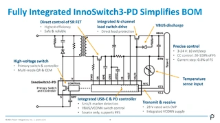 In der neuesten Serie der Bausteinfamilie InnoSwitch3 hat Power Integrations USB Type-C, USB Power Delivery (PD) und USB Programmable Power Supply (PPS) integriert, um ein Höchstmaß an Integration und einen minimalen Bauteilaufwand für Lade- und Adapterlösungen zu bieten. In seinem InSOP-24D-Gehäuse vereint InnoSwitch3-PD einen USB-C- und PD-Controller, einen PowiGaN-Hochspannungsschalter, einen quasiresonanten Multi-Mode-Sperrwandler-Controller, sekundärseitige Überwachung von Spannung und Strom, galvanisch getrennte, digitale FluxLink-Regelung und einen Synchrongleichrichter-Treiber.