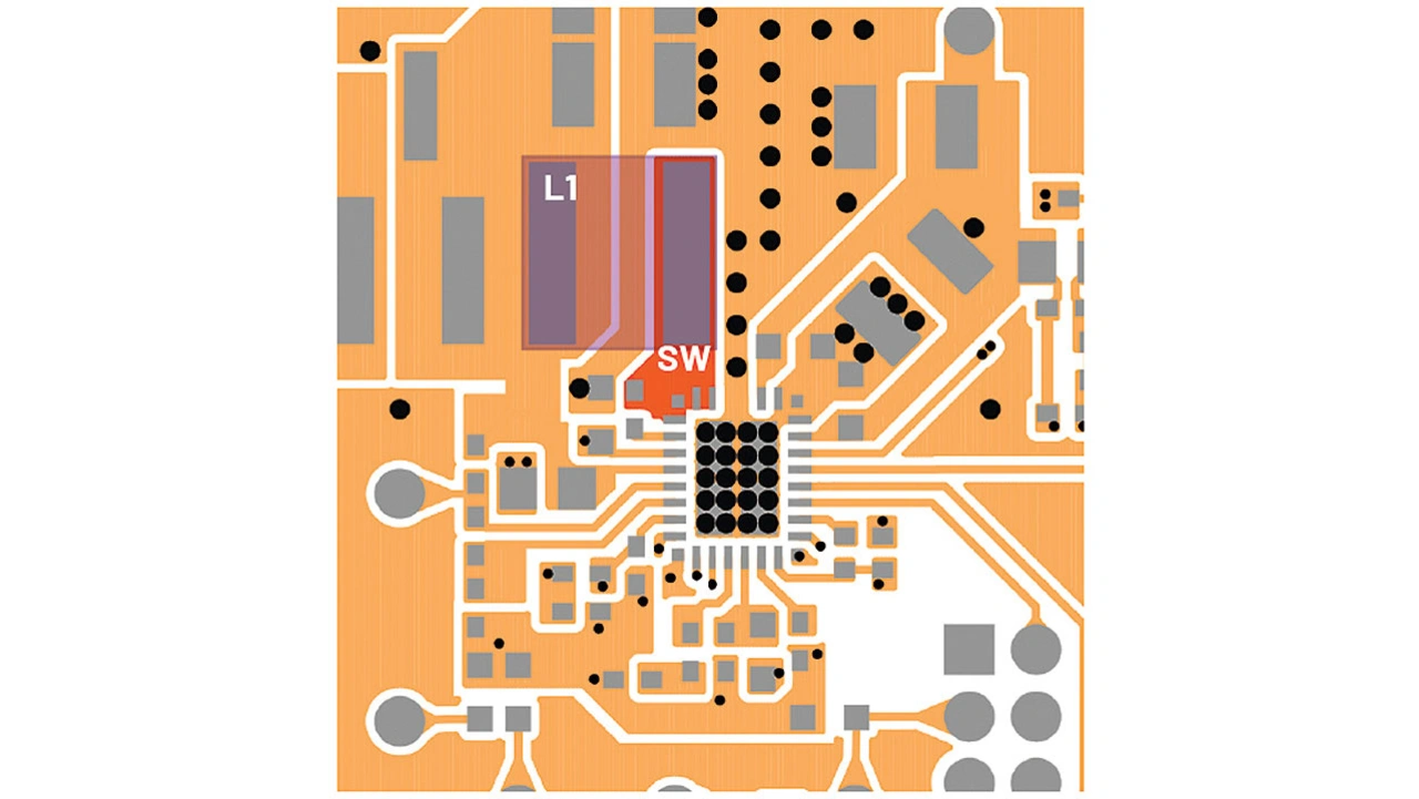 Die Kupfermenge auf der obersten Lage der Platine (Top Layer) des SW-Knotens ist auf alle Fälle zu minimieren, um die Größe der Antenne zu begrenzen. Bei einem monolithischen Schaltregler, wenn also der Leistungsschalter im IC integriert ist, läuft dieser Knoten mit einer kurzen Leiterbahn auf dem Top-Layer vom IC zur Induktivität. Liegt der Leistungsschalter jedoch außerhalb des Schaltcontroller-ICs kann der SW-Knoten außerhalb des ICs in dem Leistungsschalter selbst enthalten sein. In jedem Fall ist also sowohl bei einem Tief- als auch einem Hochsetzsteller ein Anschluss der Induktivität mit dem SW-Knoten verbunden. Wegen der großen Anzahl an beteiligten Parametern ist das Layout des SW-Knotens auf der obersten Lage in XY-Ebene der Leiterplatte oder auf internen Lagen ein wenig wie »Schwarze Magie« (Bild 1).
