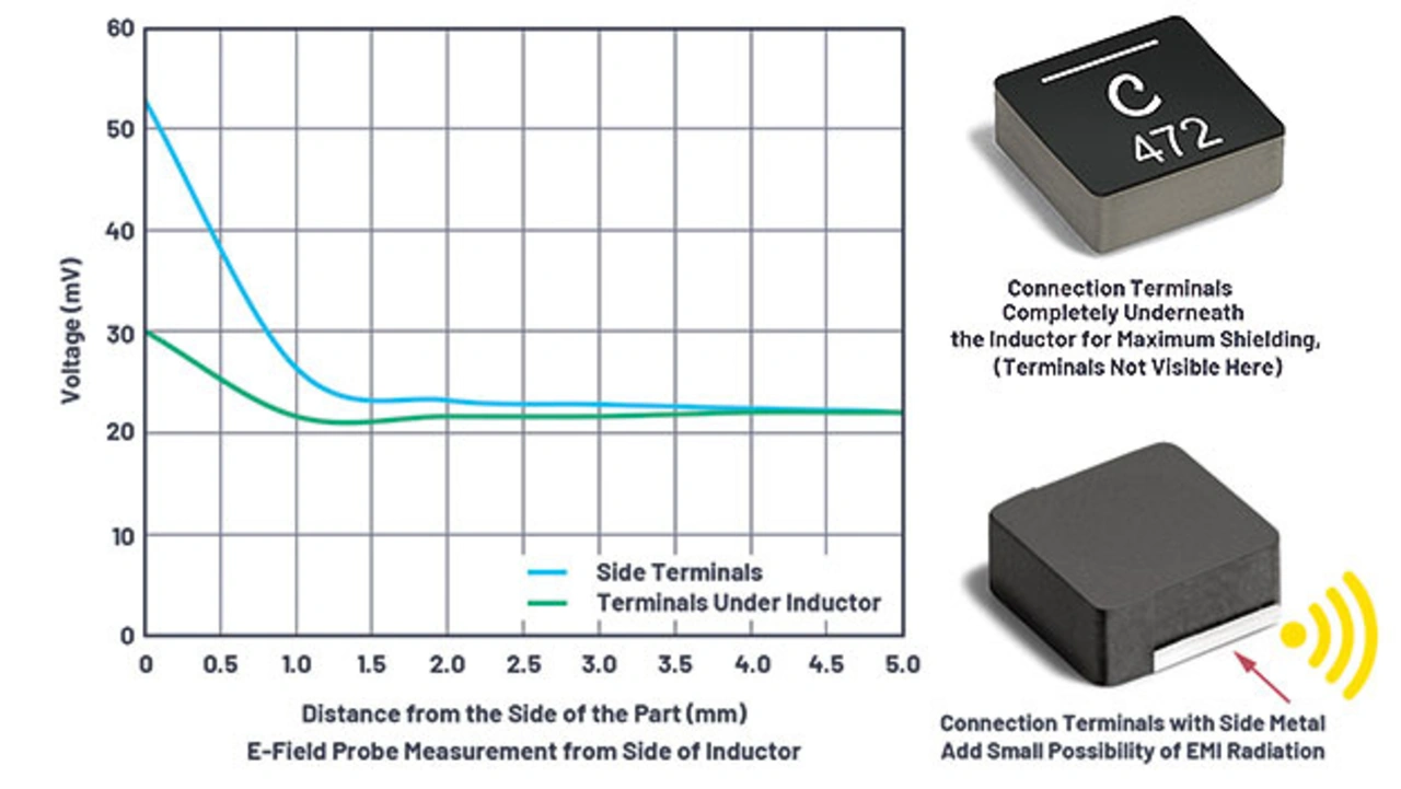 Außerdem können Spulen mit einem auf der Seite herausgezogenen SW-Knoten schlechter arbeiten als solche mit abgeschirmtem vertikalem Metall, wie in Bild 3 dargestellt. Ein Baugruppenentwickler könnte Spulen mit der geringsten Anzahl an vertikalen und herausgeführten Anschlüssen auswählen, um die Störabstrahlung zu reduzieren. Aber, was ist dann mit der Orientierung der beiden Spulenanschlüsse und ihre relative Auswirkung auf die Emissionen?