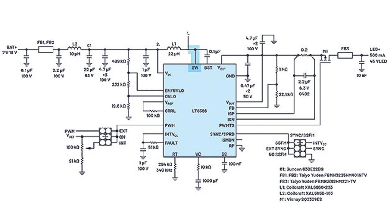 Um dies zu zeigen, untersuchte man auf dem Demoboard DC3008A mit dem LED-Treiber LT8386 die Auswirkung der Orientierung der Hauptspule L1 (Bild 4).