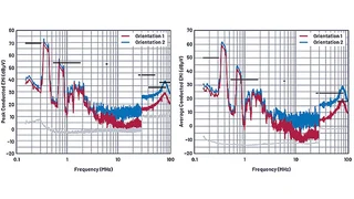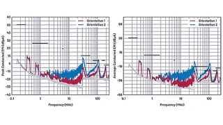 Die Bilder 6 bis 8 zeigen, dass die Stärke der Emissionen des DC3008A auf der Demo-Schaltung direkt von der Orientierung von L1 beeinflusst wird, ohne dass andere Komponenten verändert wurden. Speziell die niederfrequenten abgestrahlten Störungen (150 kHz bis 150 MHz) und die leitungsgebundenen Störungen in den FM-Bändern (70 MHz bis 108 MHz) haben bei Orientierung 1 geringere Emissionen – und zwar, weil die Seite mit dem kurzen Anschluss am SW-Knoten liegt. Ein Unterschied von 17 dBµV/m bis 20 dBµV/m im AM-Band kann ebenfalls nicht ignoriert werden.