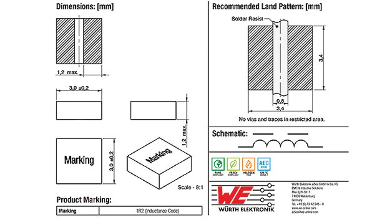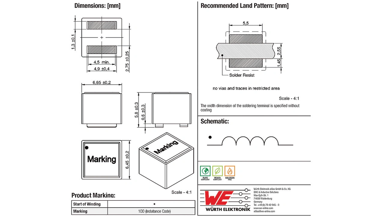 Spulen haben jedoch noch andere Parameter beziehungsweise Eigenschaften. Die Metalllegierungsspulen WE-MAPI von Würth Elektronik eiSos beispielsweise haben nur Anschlüsse auf der Unterseite des Gehäuses. Jedes Bauteil hat einen Punkt auf der Oberseite, nahe dem WE-Logo, aber dieser Punkt ist im Datenblatt nicht als Anfang der Wicklung angegeben (Bild 9). Obwohl dies zunächst einige Verwirrung stiften kann, ist zu erwarten, dass die Komponente wegen einer ziemlich symmetrischen internen Wicklungsstruktur in beiden Bestückungsorientierungen gleich arbeitet. Der Punkt auf der Oberseite der Spule muss deshalb nicht im Bestückungsplan angegeben werden. Wenn sie in einer EMI-sensitiven Schaltung eingesetzt wird, ist es trotzdem sinnvoll, beide Orientierungen zu prüfen, um sicherzugehen.