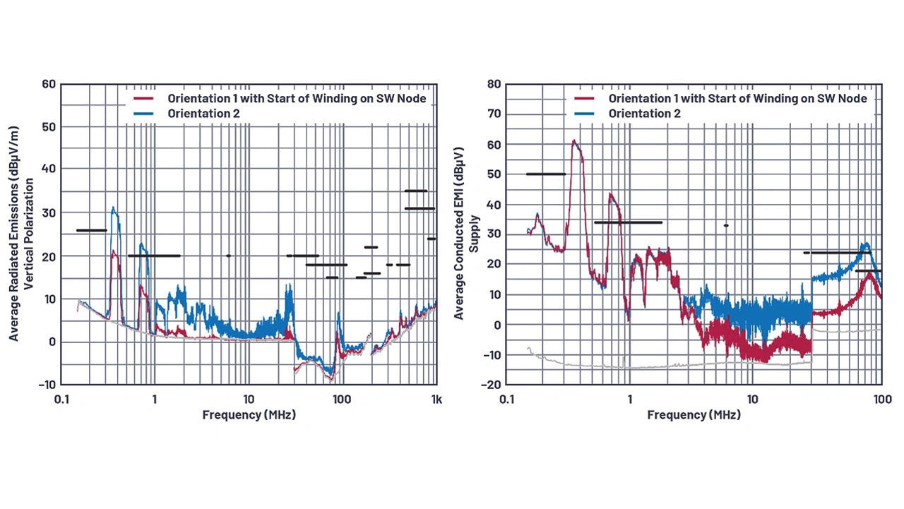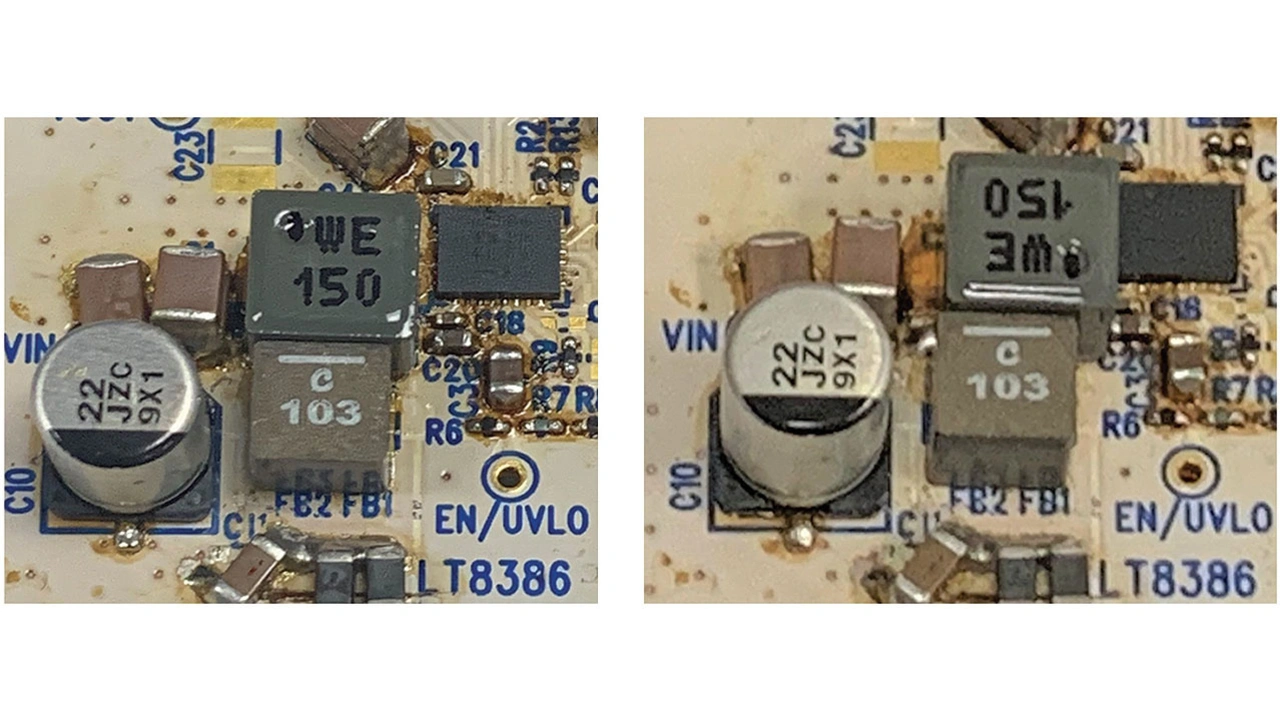 Wie herum eine Spule in Schaltreglern bestückt wird, macht einen Unterschied. Wenn man die Emissionen misst, sollte man sowohl auf die Spulenorientierung als auch auf die Wiederholbarkeit achten. Um jeglichen Unterschied bezüglich der gewählten Spule zu berücksichtigen, ist es ratsam, beide Orientierungen zu testen und der Baugruppenfertigung alle möglichen Fallstricke bei der Bestückung eindeutig mitzuteilen. Lässt sich die Orientierung nicht eindeutig bestimmen, können geringere Emissionen häufig einfach mit einer simplen Drehung der Spule um 180° erzielt werden.
