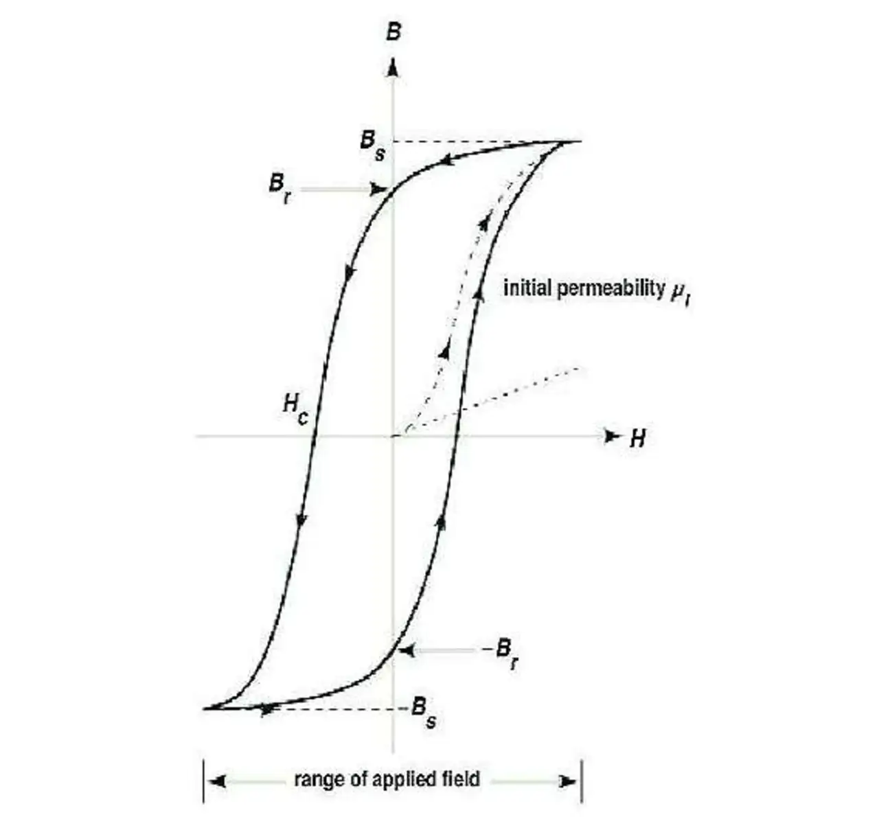 Wenn ein magnetisches Feld mit einer ausreichenden Stärke zur Sättigung des Materials angelegt und dann entfernt wird, bleibt das Material magnetisiert; es bleibt die so genannte Remanenzflussdichte (Br und -Br in Bild 1) zurück. Um das Material zu entmagnetisieren, muss ein Magnetfeld einer bestimmten Stärke in der entgegengesetzten Richtung angelegt werden, Koerzitivfeldstärke (Hc in Bild 1) genannt.