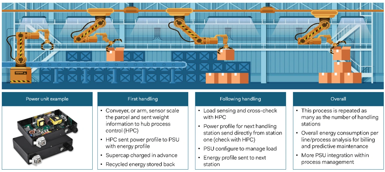 Die Stromversorgungen, mit denen bereits 2021 experimentiert wurde, sind in das komplette Ökosystem für die Kommunikation von Maschine zu Maschine integriert (Bild 1). Sie liefern nicht nur Strom an eine Last, beispielsweise an die Motoren von Förderbändern, sondern können auch die Menge an Energie, die in lokalen Superkondensator-Bänken zu speichern ist, erkennen und anpassen (Bild 2).