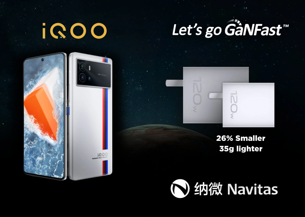 Besonders erwähnenswert sind hierbei die GaNFast-ICs von Navitas, die im 120-W-Ladegerät für das Flaggschiff-Mobiltelefon iQOO 9 Pro von vivo verbaut sind (Bild 5). Dies zeigt die schnelle Akzeptanz von GaN in der Remote-Working-Branche. Neben der höheren elektrischen Leistung reduziert die Verwendung von GaN die Abmessungen um 26 Prozent und erreicht eine Leistungsdichte von 1,3 W/cm³.