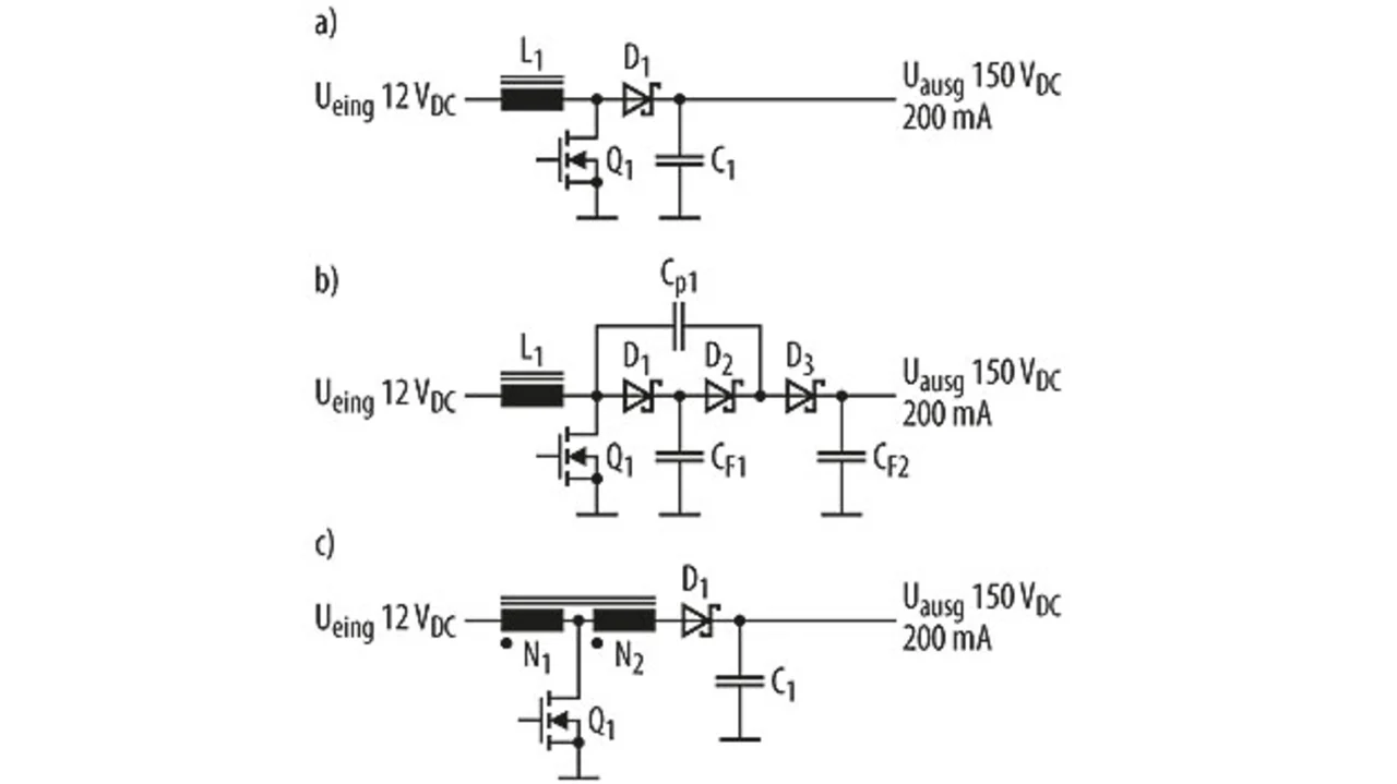Eine besondere Anforderung stellt dabei etwa die Erzeugung einer Spannung von 70 V mit einem Übersetzungsverhältnis von 10:1 und mehr. Diese Anforderung lässt sich mit verschiedenen Topologien erfüllen (Bild 1): einfacher Aufwärtswandler, um Ladungspumpen erweiterter Aufwärtswandler und Aufwärtswandler mit Anzapfung an der Arbeitsspule [1]. Jede dieser Topologien hat natürlich ihre Vorteile, aber wenn es darum geht, bei großen Übersetzungen auch große Leistungen bereitzustellen, sind diese drei Varianten weniger geeignet.