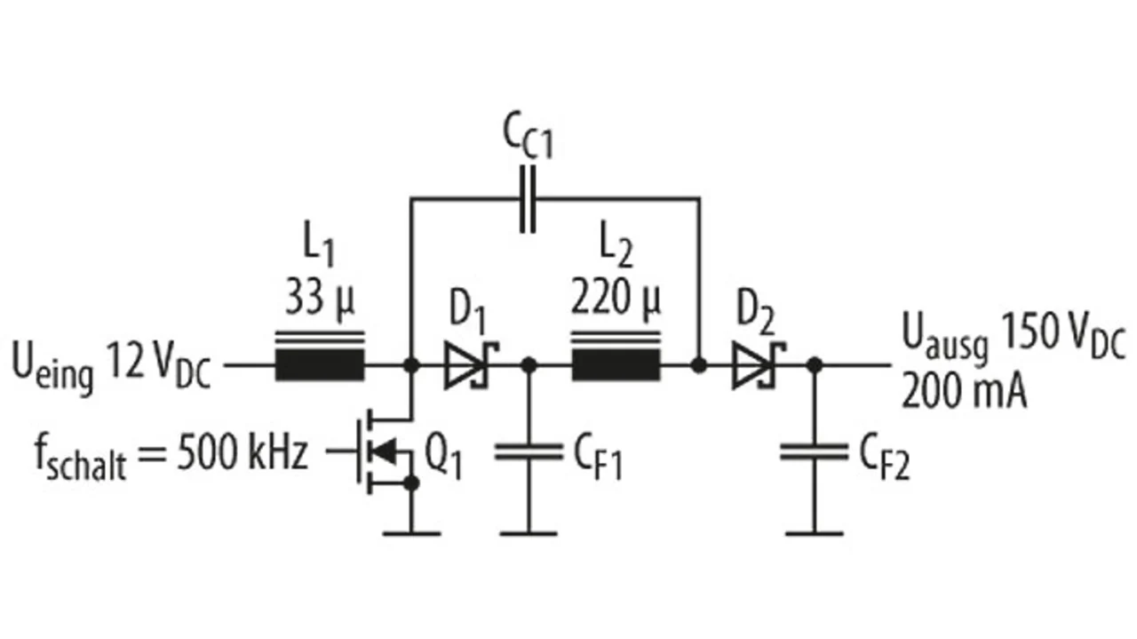 Mit einer neuen Spannungswandler-Topologie [1] lassen sich die geschilderten Nachteile vermeiden. Diese erlaubt die Verwendung von MOSFETs mit niedrigeren Grenzwerten und Schottky-Dioden; die Schaltung arbeitet dabei nicht mit extremen Tastverhältnissen und erleichtert so den „nichtlückenden Betrieb“ (CCM – Continuous Conduction Mode) und die Verwendung der Pulsbreitenmodulation (PWM). Zudem vermeidet die Schaltung Spannungsspitzen und Überschwinger, die von den Streuinduktivitäten eines Transformators verursacht werden. Bei dem neuen Spannungswandler handelt es sich um einen zweistufigen Aufwärtsregler mit Vervielfacher in SEPIC-Topologie (Single Ended Primary Inductance Converter) (Bild 2).