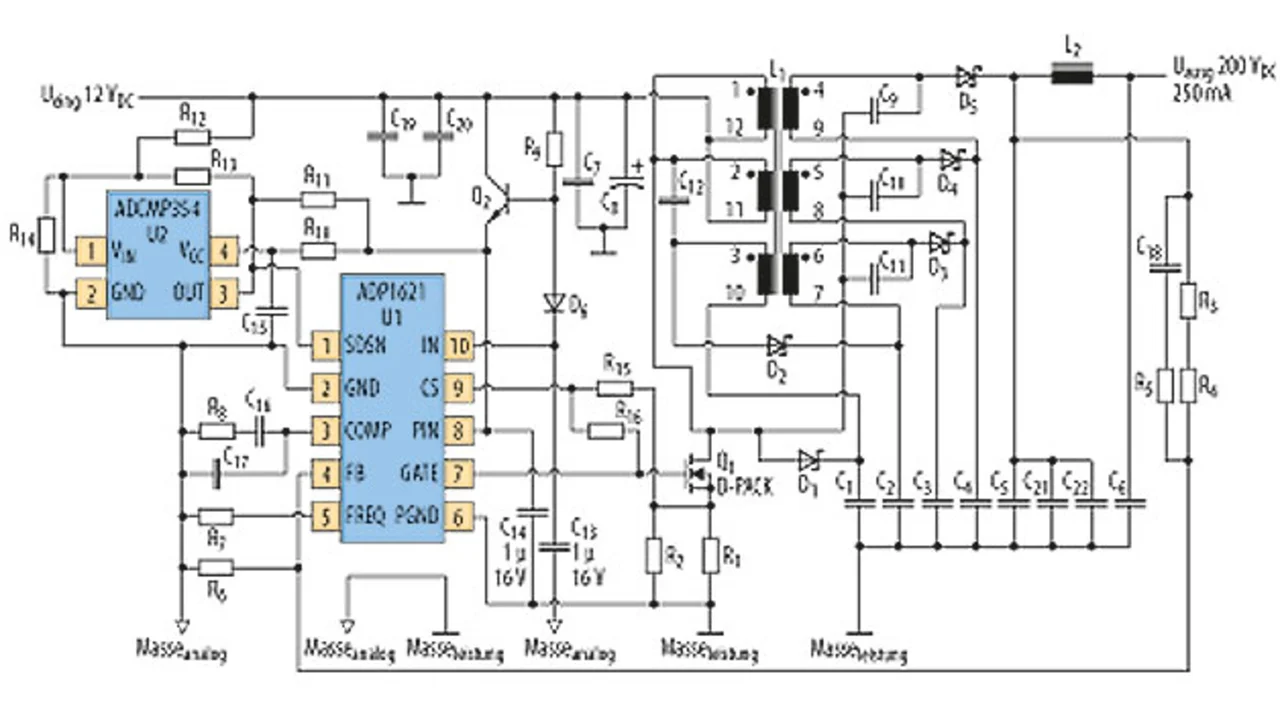 Die neue Topologie wurde von den Analog-Devices-Applikationsingenieuren mit dem Controller-Baustein ADP1621 aufgebaut (Bild 3). Der Baustein wurde konzipiert für den Aufbau eines stromgeregelten Aufwärtswandlers, der mit einer festen Schaltfrequenz arbeitet. Der MOSFET und die Schottky-Dioden in dieser Schaltung sind für 60 V spezifiziert; mit dem Komparator ADCMP354 wird die Funktion der Abschaltung bei Unterspannung realisiert. Nach Angaben von Analog Devices erreicht der Spannungswandler einen Wirkungsgrad von 91 %.
