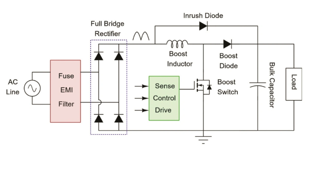 Ein grundlegender Baustein in allen Netzteilen ab 75 W ist die Leistungsfaktorkorrektur (Power Factor Correction, PFC), denn die IEC 61000-3-2 fordert einen Leistungsfaktor – also der Quotient aus Wirk- und Scheinleistung – von über 0,9. Eine solche Schaltung lässt sich mit unterschiedlichen Architekturen und Topologien implementieren, der gebräuchlichste Ansatz aber nutzt einen Hochsetzsteller (Boost Converter; Bild 1). Dieser wandelt die eingangsseitige Wechselspannung – üblicherweise 90 V bis 264 V bei Netzfrequenzen von 47 Hz bis 63 Hz – in eine nominale Gleichspannung von 400 V.