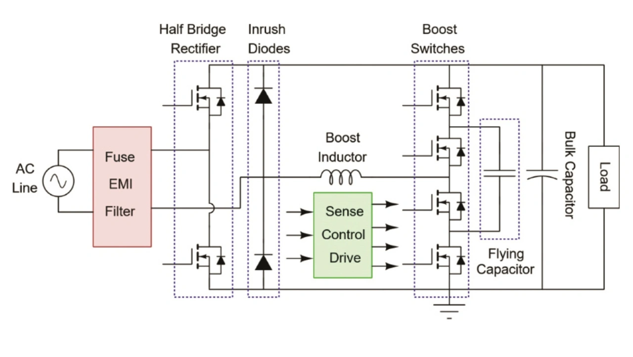 Sind hohe Spannungen und Leistungen zu schalten, kommen schon seit einiger Zeit sogenannte Multilevel-Wandler zum Einsatz. Solche Topologien haben sich mit Siliziumtransistoren in der Praxis bereits bewährt. Bild 3 zeigt, wie sich damit eine Totem-Pole-PFC-Stufe und sich implementieren lässt. Multilevel-Topologien bieten einige zusätzliche attraktive Merkmale: