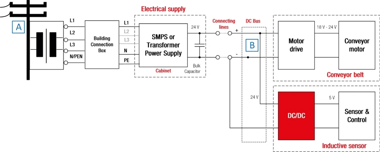 Es gibt in der Regel nicht nur eine einzige mögliche Ursache für eine Transiente auf dem DC-Bus, die zu einem abrupten Anstieg führt. Der Ursprung der Transiente kann wie in Bild 1 Teil A ein Blitzeinschlag sein (in diesem Fall spricht man von einem Überspannungsstoß, »Surge«), oder sie kann im System selbst erzeugt werden (Bild 1, Teil B). Klassischerweise ist der 24-V-Bus im industriellen Umfeld für 19,2 bis 30 V spezifiziert. Bei der Betrachtung transienter Überspannungen müssen weitere Effekte berücksichtigt werden. Ist zum Beispiel die 24-V-Versorgungsleitung parallel zur Steuerleitung eines Frequenzumrichters verlegt, sind die Impulse kapazitiv gekoppelt und die 24 V schwingen im Pulsmuster des Frequenzumrichters.