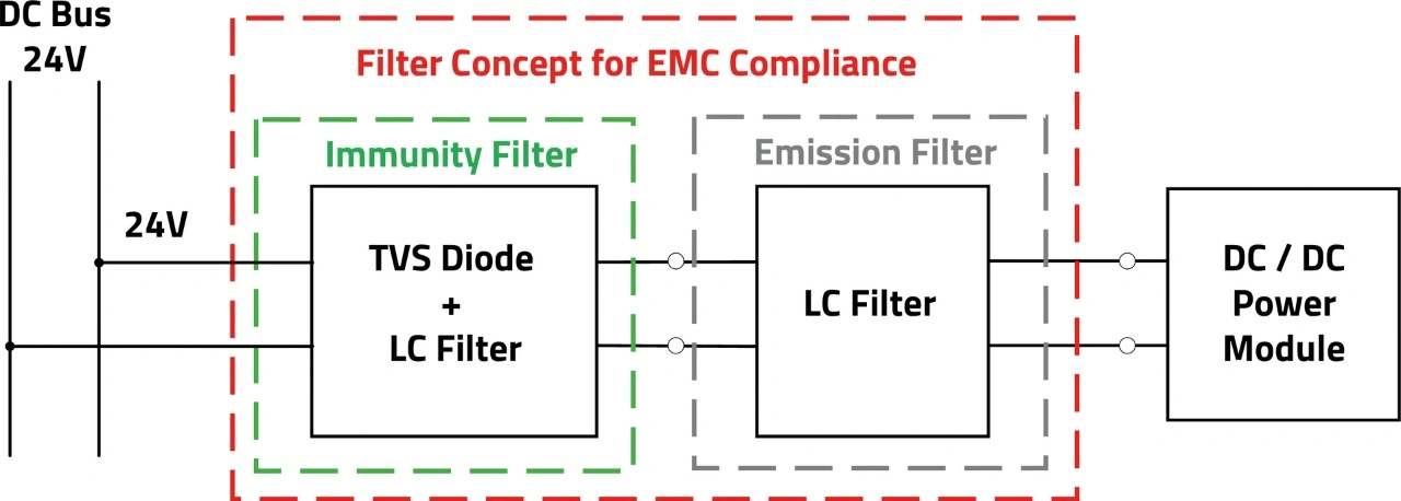 Bild 2 zeigt das gesamte Konzept eines Filters zur Erhöhung der Störfestigkeit (grün), das zwei Filterstufen umfasst. Eine Stufe klemmt die hohe transiente Überspannung während eines Überspannungsereignisses, was mit Bauteilen zur Transientenunterdrückung wie unidirektionalen TVS-Dioden erreicht werden kann. Für die zweite Stufe wird ein passives LC-Filter empfohlen, das die Spannungspegel dämpft, die die maximale Betriebsspannung des DC/DC-Wandlers überschreiten.