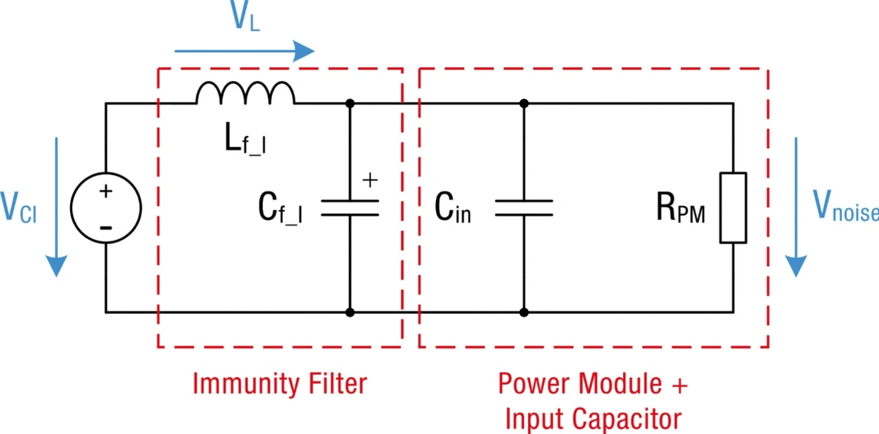 Gleichung 2 berücksichtigt die resultierende Klemmspannung VClamp max der TVS-Diode während des Überspannungsereignisses und die maximale Betriebsspannung VPM_max des gewählten Wandlers. Die Aufgabe besteht darin, das Filter gemäß Bild 3 zu entwerfen, wobei der TVS-Diode ein LC-Filter angefügt wird. Der Entwickler kann, um einen entsprechenden Filterkondensator zu berechnen, den Wert der Induktivität wählen.