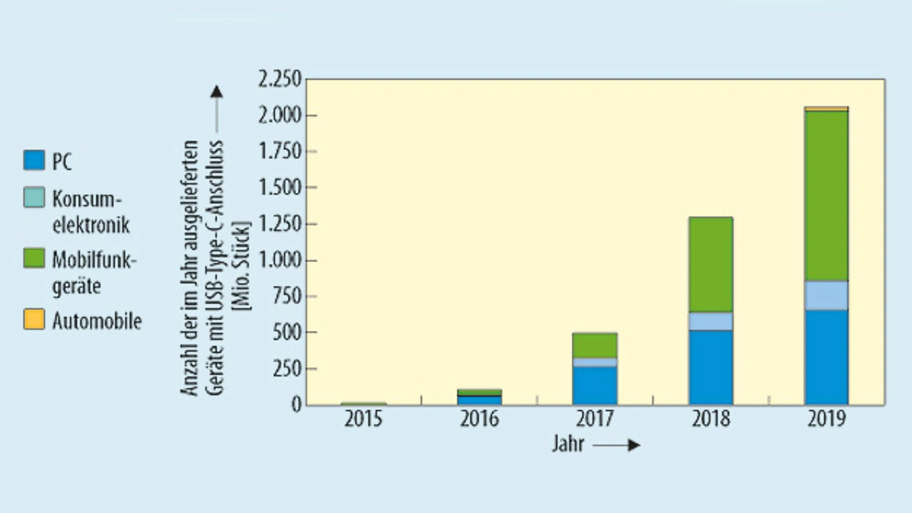 Der ursprünglich Mitte der 1990er Jahre entwickelte USB-Standard wurde kürzlich wesentlich erweitert. Insbesondere sind ein neuer Steckverbinder (Type-C) und das neue USB-PD-Protokoll (Power Delivery) hinzugekommen. Der neue USB-PD-Standard erlaubt eine variable Ausgangsspannung von 5 V bis 20 V. Geräte, die das neue PD-Protokoll nutzen, können über eine dedizierte CC-Leitung (Configuration Channel) mit der Stromversorgung kommunizieren. Außerdem kann der neue, richtungsunabhängige Type-C-Steckverbinder Ströme bis zu 5 A übertragen. Ziel des USB Implementers Forum (USB IF) – des für die Entwicklung des neuen Standards verantwortlichen Industrieverbands – ist ein Standard, der den Benutzern von USB-Geräten zahlreiche Vorteile bringt: USB-PD ermöglicht es, Daten, Betriebsspannungen und Audio/Video-Daten über ein und dasselbe Kabel zu übertragen, das auf beiden Seiten identische Steckverbinder hat, die überdies dünner und robuster als die bisherigen sind. Der neue USB-C-Standard erweitert die Anwendungsmöglichkeiten für die USB-Schnittstelle auf noch mehr Gerätetypen. Es wird erwartet, dass die Anzahl der Geräte mit USB-PD/Type-C-Schnittstelle in den kommenden Jahren stark zunehmen und bis 2019 die 2-Milliarden-Grenze erreichen wird (Bild 1).