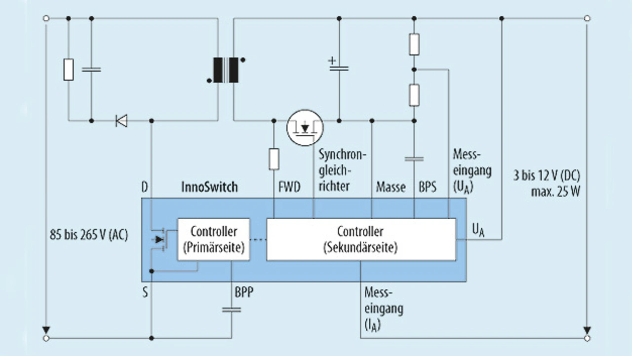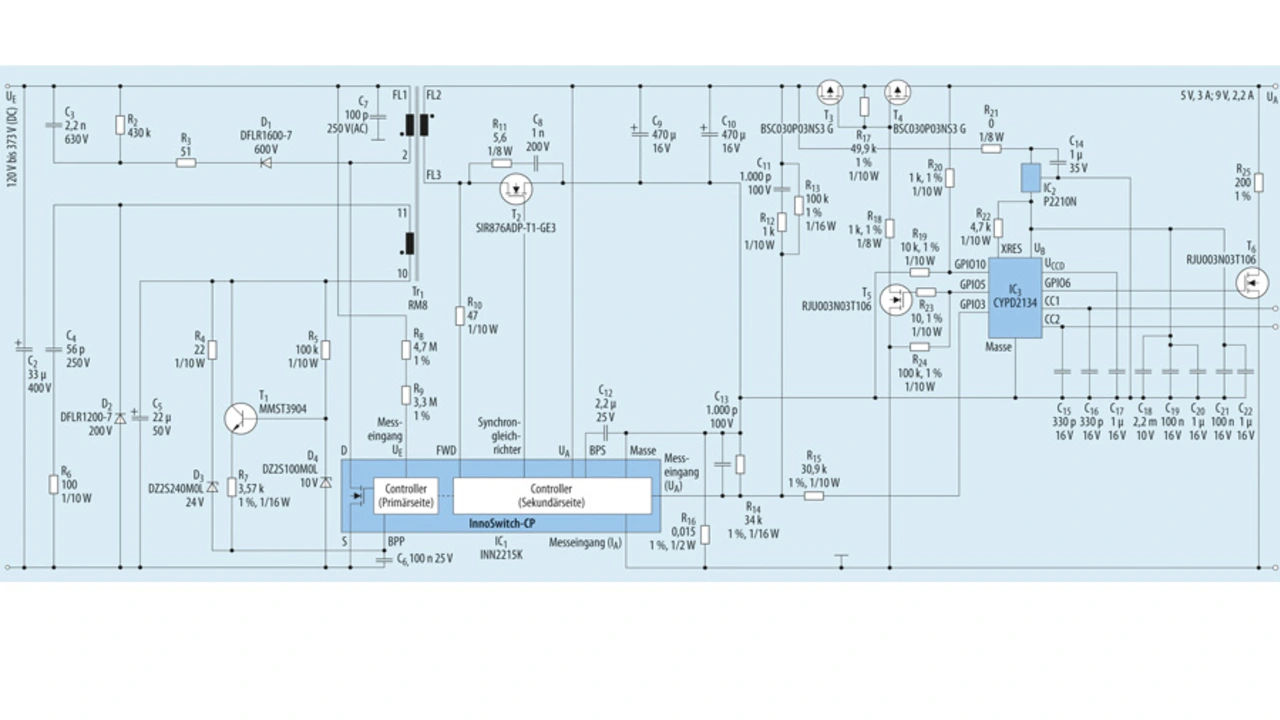 Im USB-PD-/Type-C-konformen Referenzdesign DER-533 [7] für eine steuerbare Stromversorgung mit 5 V, 3 A oder 9 V, 2,2 A hat Power Integrations seinen Schaltregler-IC InnoSwitch INN2215K mit dem Schnittstellen-Con¬troller CYPD2134 von Cypress kombiniert. Der Schnittstellen-Controller enthält einen Type-C Transceiver einschließlich Abschlusswiderständen und ist intern gegen elektrostatische Entladung geschützt; das verringert den Bauteilaufwand. Als externes Netzteil erfüllt oder übertrifft die Referenzdesignschaltung (Bild 4) die Wirkungsgrad-Anforderungen des US-amerikanischen Energieministeriums (DOE), Level 6 [1], und der freiwilligen Selbstverpflichtung der Industrie für Europa (CoC), Stufe 2 [2].