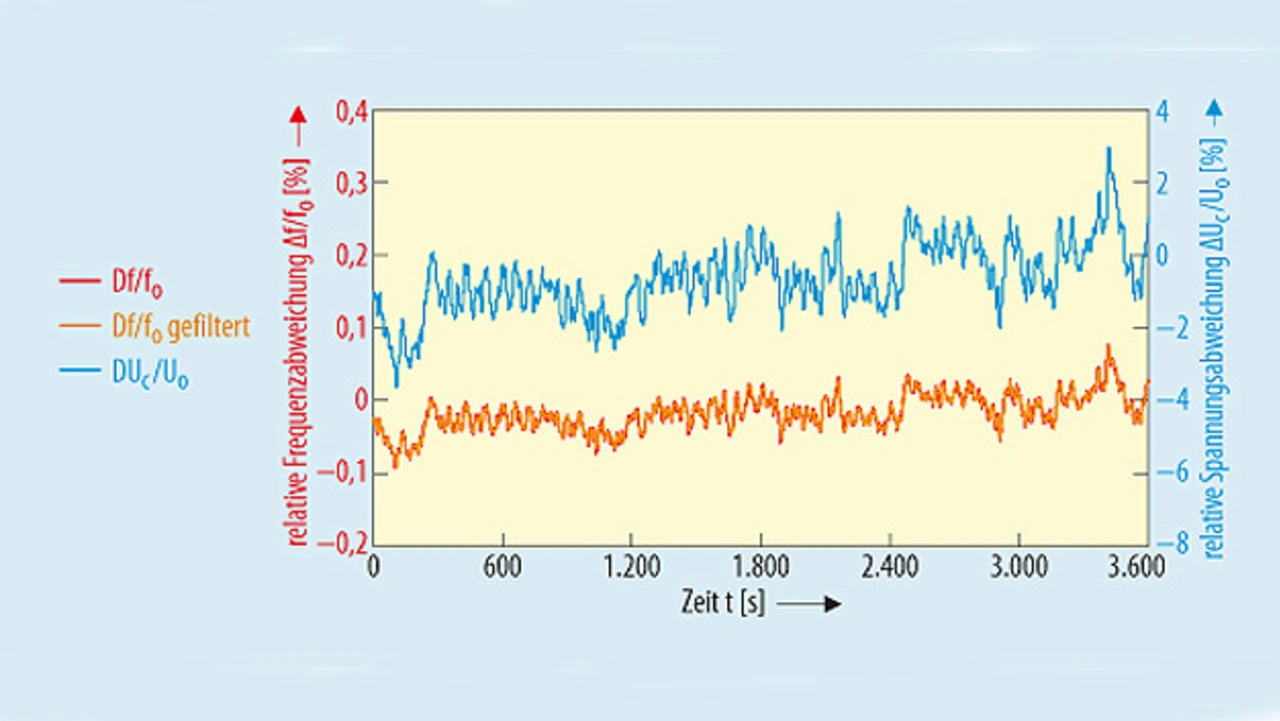 Bild 4 zeigt noch einmal den exemplarischen Frequenzverlauf (rot) und den Verlauf der berechneten Spannungsvariation (blau). Während der beobachteten Zeit bleibt er innerhalb eines Fensters von ±3,6 % der Nennspannung. Das ist ein vergleichsweise kleiner Wert, den nachfolgende Regelstufen üblicherweise problemlos beseitigen können.