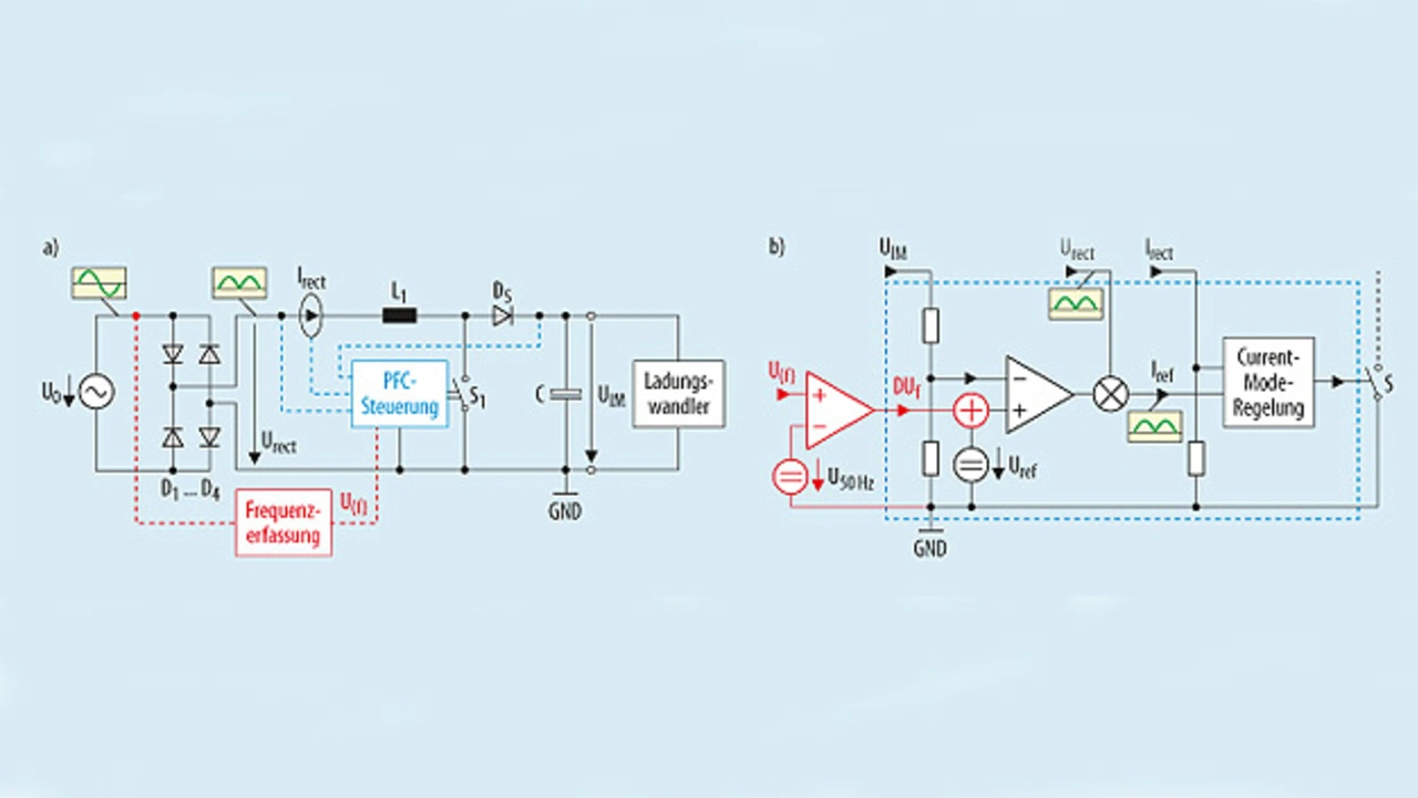 Schaltnetzteile, die eine gewisse Leistung überschreiten, müssen eine erste Stufe enthalten, die den Leistungsfaktor innerhalb gewisser Grenzen hält. Bei Leuchten-Treibern gilt das beispielsweise ab 25 W (EN 61000-3-2). Eine sogenannte Leistungsfaktorkorrektur (PFC) wird normalerweise als Hochsetzsteller ausgeführt [13]. Bild 5 zeigt eine typische Schaltung. Sie regelt den Leistungsfluss zum Zwischenkreiskondensator: Wenn die Zwischenkreisspannung fällt, benötigt die LED zu viel Leistung und der Regler erhöht den Strom und damit die Leistungsaufnahme aus dem Netz. Wenn die Zwischenkreisspannung zu hoch ist, reduziert er die Leistungsaufnahme. Im Allgemeinen versucht der Regler, die Zwischenkreisspannung auf einem vorgegebenen Wert zu halten. Dabei gibt es die einen oder anderen Probleme, welche aber hier nicht betrachtet werden sollen.
