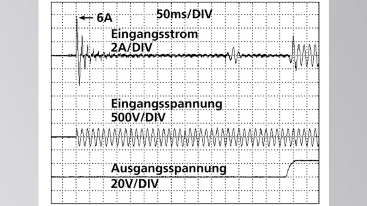 Beim Einschalten fließen hohe Ströme ins Netzteil. Noch höher sind sie bei einem sogenannten Warmstart, wenn also die strombegrenzenden NTCs aufgrund hoher Temperaturen niederohmig sind. Das belastet Sicherungen und Schalter, die für solche Fälle überzudimensionieren sind. Durch eine aktive Einschaltstrombegrenzung liegt der Einschaltstrom des CPS10 bei 6 A (Bild 4) – auch beim Warmstart.